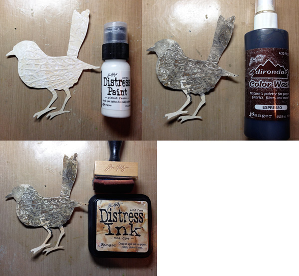 Then I followed Tim’s technique of applying white, Picket Fence, Distress Paint. I let this dry before applying the Adirondack Color Wash in Espresso {I didn’t have any Distress Stain}. I sprayed it on my Craft Sheet, sprayed some water and dragged the die cut bird through it. I finished with a light touch of Tea Dye, Distress Stain using a Blending Tool.