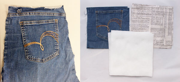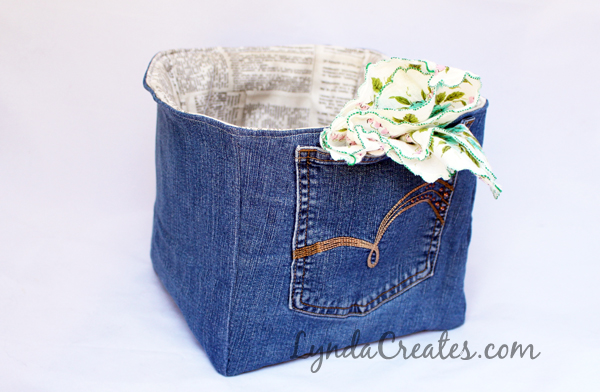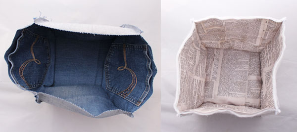 I made a lined denim basket with their original pockets intact. Usually when clothes are damaged or stained they end up in the trash. I wanted to recycle the usable parts of the denim to save them from the landfill.
