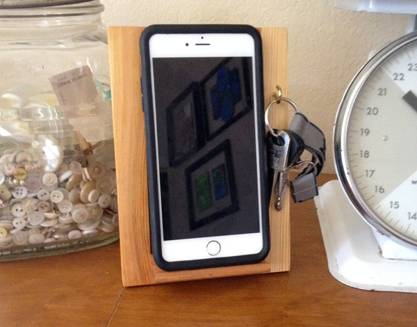The Ikea frame also comes with a metal stand to insert in the back. I also added a small hook on the front of the frame to hold keys. The Scrabble tile ledge holds the phone and keeps everything neat.
