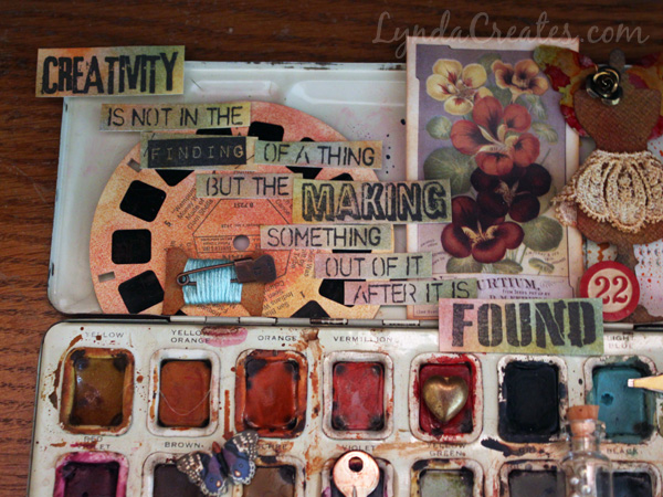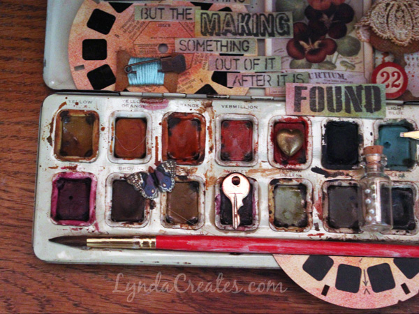 I started with a used, vintage watercolor tin. I used to love these tins especially when they were brand new. For this project, I liked the fact that this was found well-used but still quite full of paint.