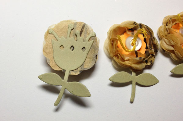 I adhered the back of the tissue flowers to the top of a flower/stem die cut so the stem will show below the flower.