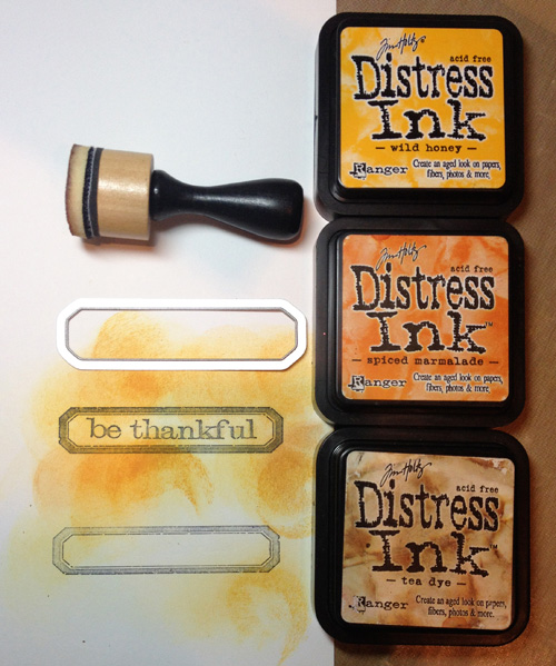 Using the stamp and Framelits Acorn Blueprint set by Tim Holtz, I first stamped the phrase and border on a piece of white cardstock using Stazon black ink. I added Autumn colored Distress Ink before die cutting the shape.
