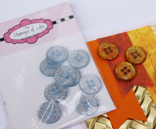 The buttons are actually the glittery clear buttons from The Stamps of Life. I used Alcohol Ink to match the color of my Autumn card. Here’s a before and after shot of the buttons.