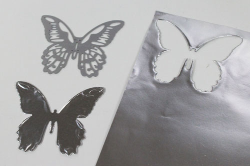 To begin, I die cut the butterfly shape out of the silver Rinea foil using the Sizzix Detailed Butterflies die.