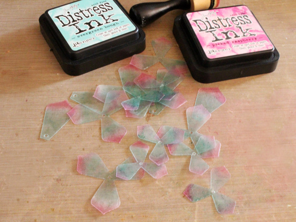 I wanted to experiment with coloring the plastic so I started with Distress Inks in Evergreen Bough and Picked Raspberry.