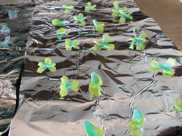The really nice part about the way the Shrinky Dinks melt is that they curl, which makes them look very natural as succulents. I used hot glue to assemble three large leaves, two medium leaves and two small leaves into each tiny succulent plant.