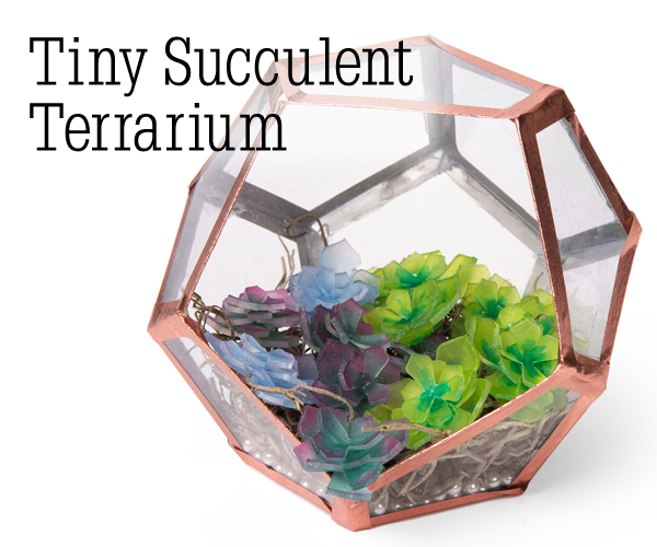 To create the terrarium, I first layered some thrifted pearls on the bottom to look like sand. I added a layer of dry moss and then placed the completed succulents on top of the moss. Each tiny succulent is about the size of a penny.