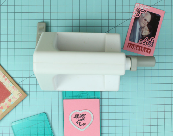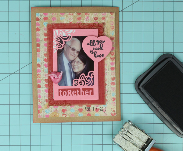 Stamp the phrase “all you need is love” on the remaining pink paper and die cut using the heart Framelit.