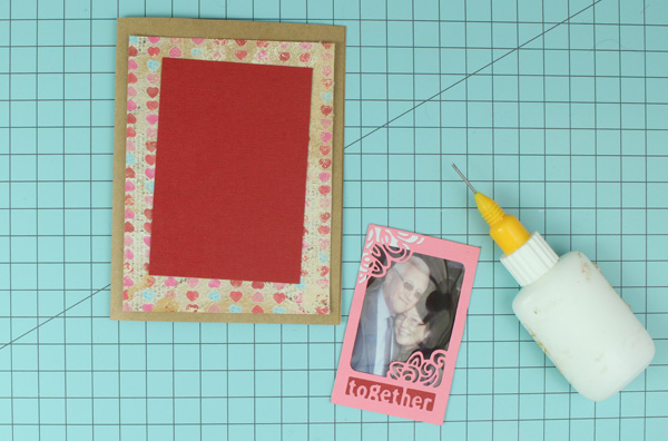 Adhere the photo on the red paper. Add foam dots to the back of the die cut pink heart.