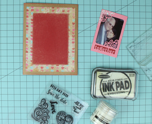 Using the heart pattern paper from the Picture This! paper pad, trim to 3 3/4″ x 5″ and adhere to the front of the card. Adhere the red paper. Using clear embossing ink, stamp the swirl corner shape on the bottom left corner of the red layer and apply clear embossing powder. Repeat on the top right corner.