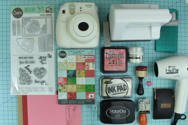 You will need my Lovely set of dies and stamps by Sizzix, SideKick {or BigShot} machine, Instax camera or Share Printer, my Picture This! paper pad by Sizzix, Worn Lipstick Distress Ink, clear Embossing Powder, Embossing ink pad, StazOn black ink, ink applicator, Sanding block, Embossing gun, cardstock: kraft color 8 1/2″ x 5 1/2″, Pink 2 1/8″ x 5 1/2″ and Dark red KraftCore 2 3/4″ x 4″, stamping block, foam dots, tape runner and liquid adhesive. I also used a small pink heart-shaped button and a standard date stamp as optional embellishments.