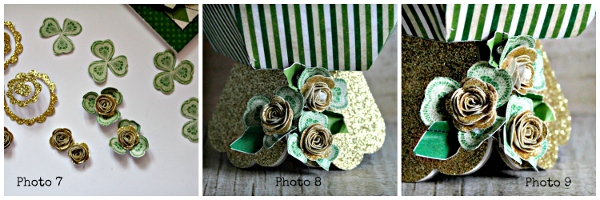 Photo 9: Add fussy cut leaves to flowers to finish the Pot of Gold Treat Box. (Add your favorite candy.)
