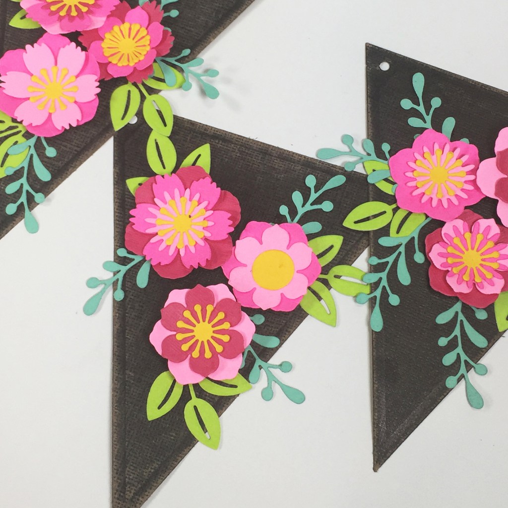I layered all of the flowers a little differently. I adhered the leaves first then added the flowers using foam dots on one flower on each banner to add more depth.