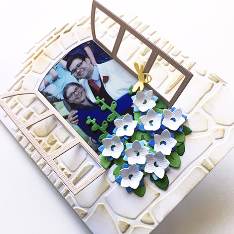 I die cut lots of green vines and leaves to fill the flower box area and adhered the columbine flowers in front. You can see the tan window frames here.