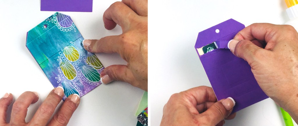 For each completed Zip Gift Tag, you will need the painted front, a die cut zipper back and a gift card if you are including it as a gift. Apply a thin bead of liquid adhesive around the edges of the Zip Gift Tag back piece. Do not apply adhesive on the zipper area. Place the gift card on the zipped tag being careful to avoid touching the adhesive.