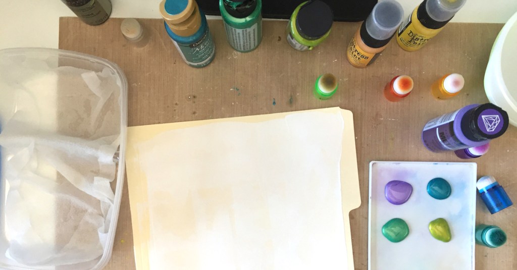 - Acrylic paint in various colors – We used DecoArt Metallic Teal, Folk Art Metallic Amethyst, Folk Art Color Shift Emerald Flash, Folk Art Color Shift Green Flash and Ranger Distress Paint in Mustard See