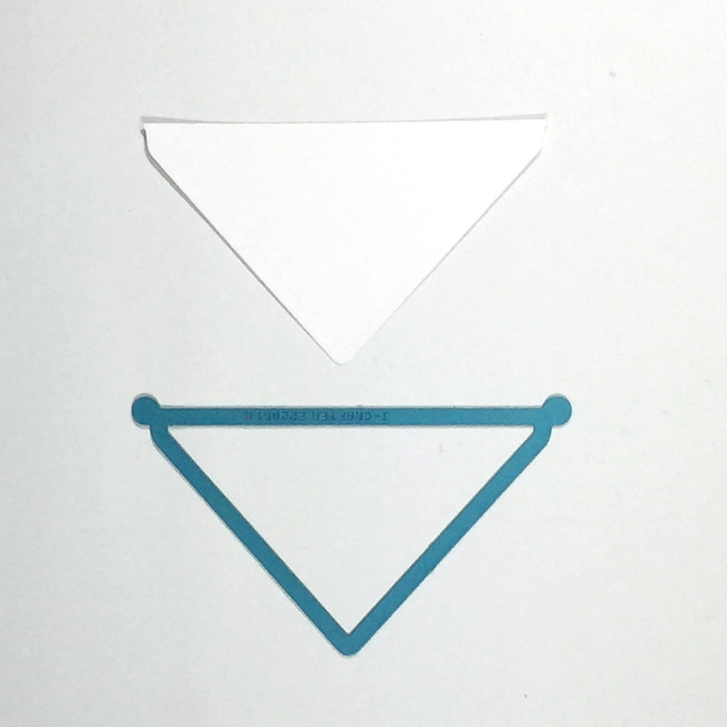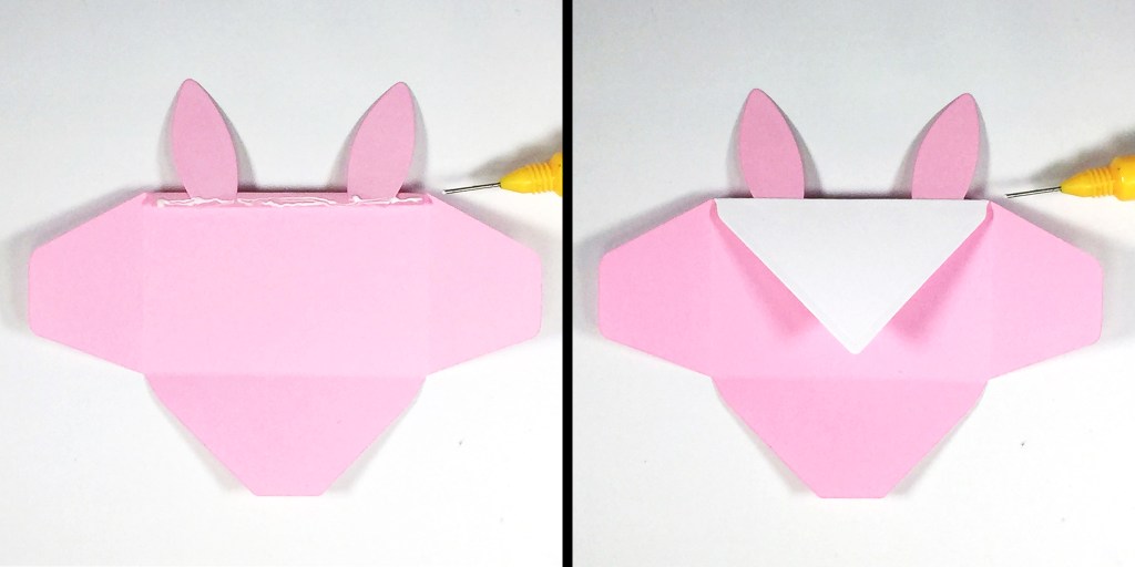 Apply adhesive along the small top tab including over the base of the ears. Attach the white triangle to the top tab.