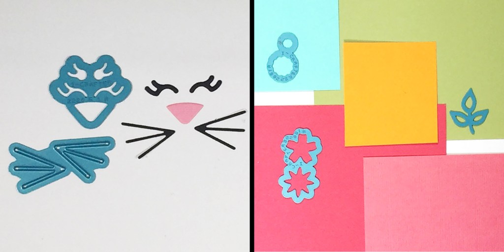 Die cut the eyes and whiskers from black card stock. Die cut the nose from darker pink card stock.