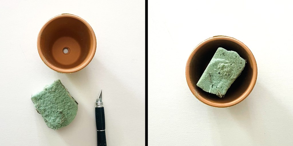 Use a craft knife to trim a piece of floral foam to fit inside the pot.