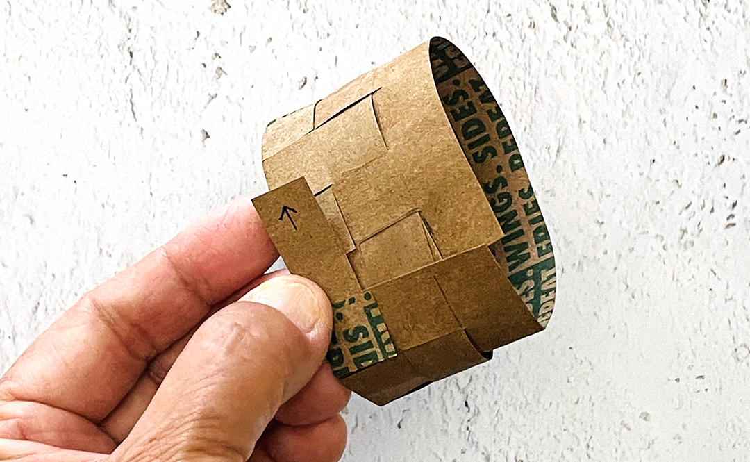 Create a ring by bringing the ends of the horizontal strips around to make a circle. I drew arrows on the ends of the horizontal strips to better show how to finish the ends. Weave the first horizontal end behind the second vertical strip. The image shows the center strip being woven first