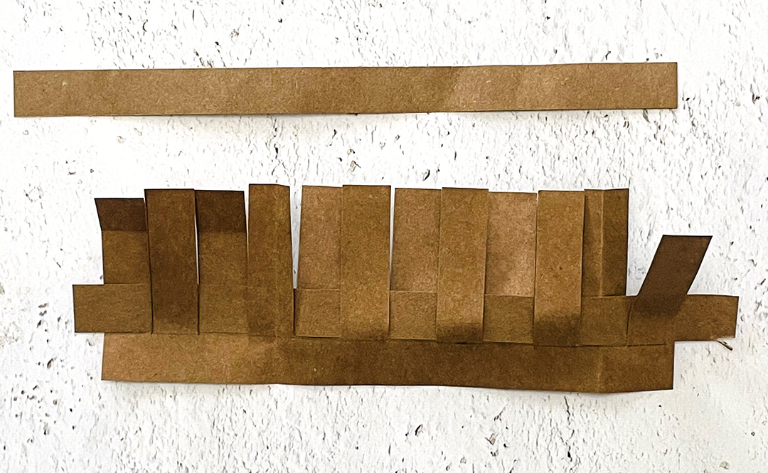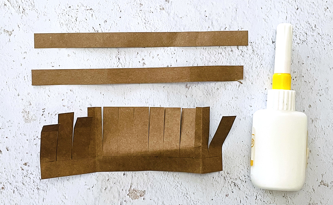 Print the template and lay it on a piece of brown paper bag. Cut two strips at 7″ wide by 1/2″ high. Cut the larger piece at 6″ wide by 2 1/8″ high. Do not cut along the dotted line at the top. Cut the vertical lines at 1/2″ widths.