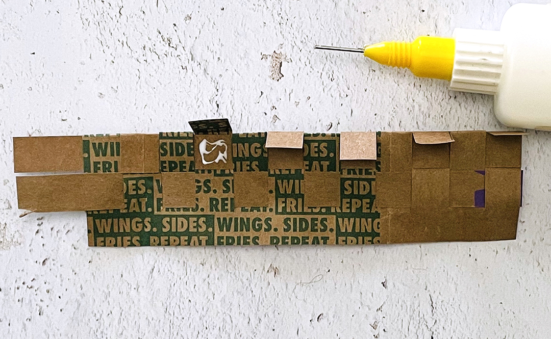With one of the long strips, start weaving over and under across the short, vertical strips.