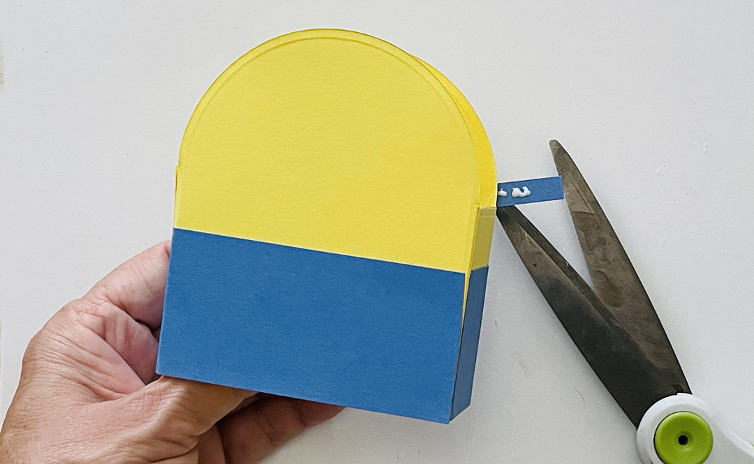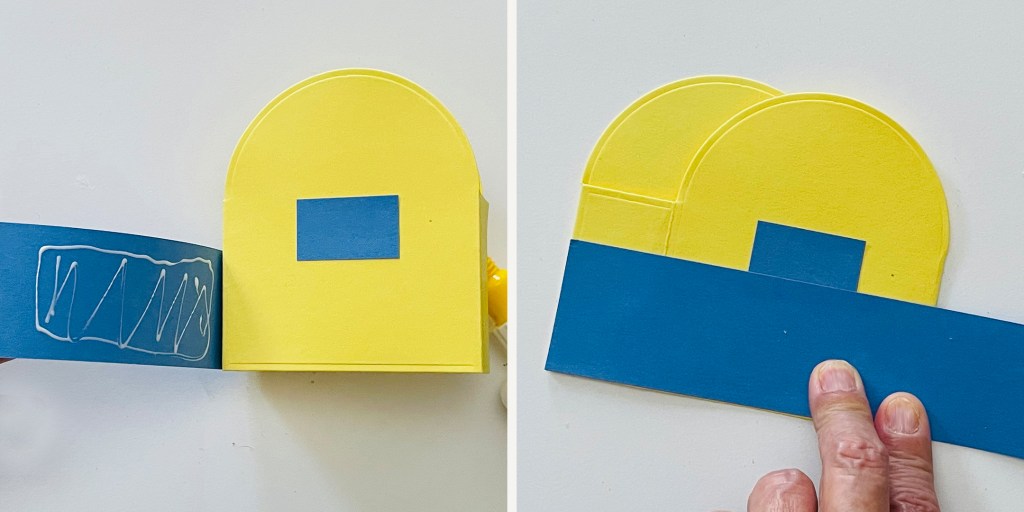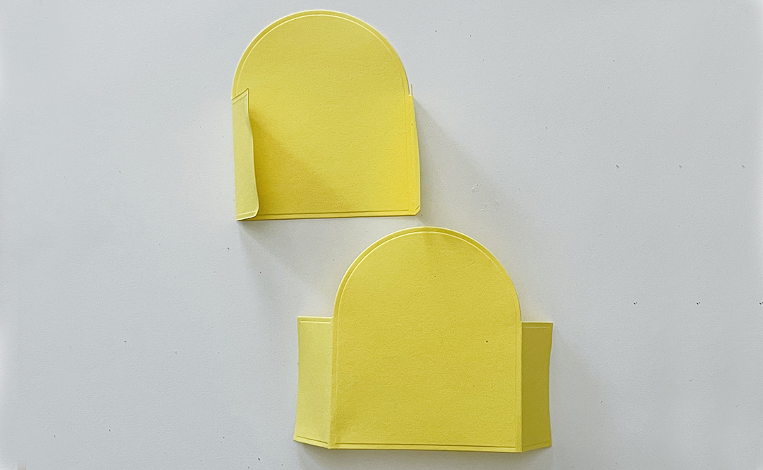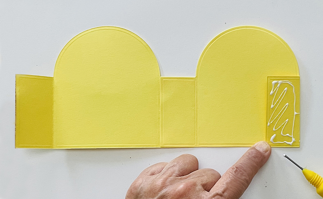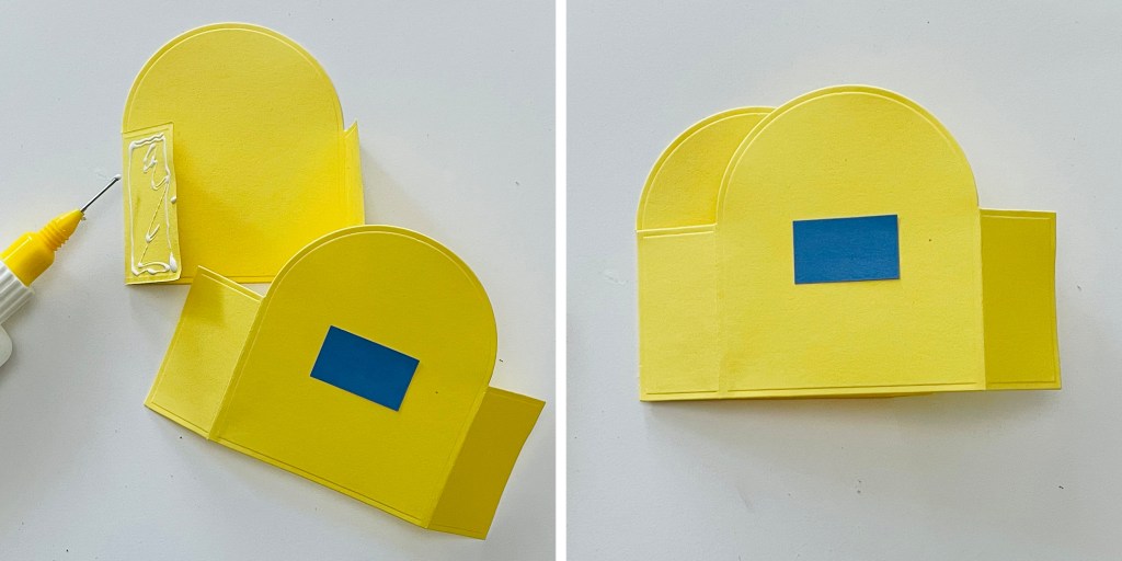 Apply adhesive to the left side tab on the back yellow shape and adhere it to the left side tab on the front