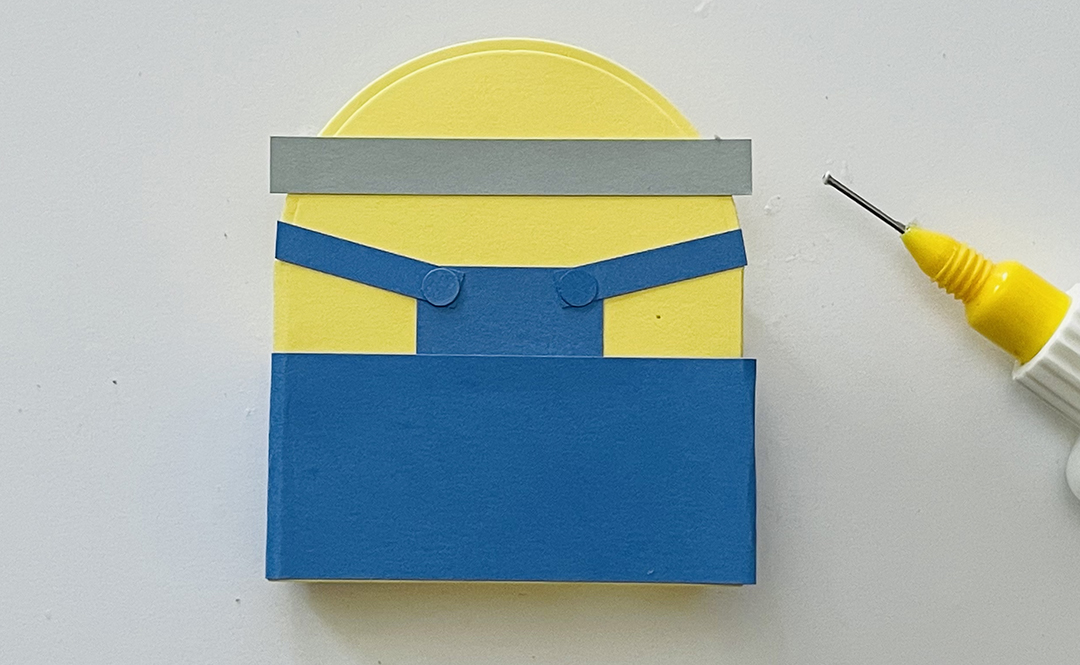 Place the blue pants shape along the bottom of the yellow shape. Do not adhere yet. Adhere the smaller blue bib shape in the center, behind and above the top of the blue pants.