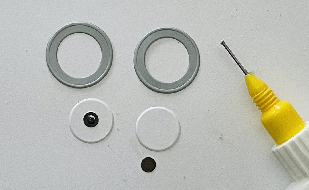 Assemble the eyes by adhering the 1/4″ brown circle in the middle of the white circle. Adhere the black dot in the middle of the brown circle.