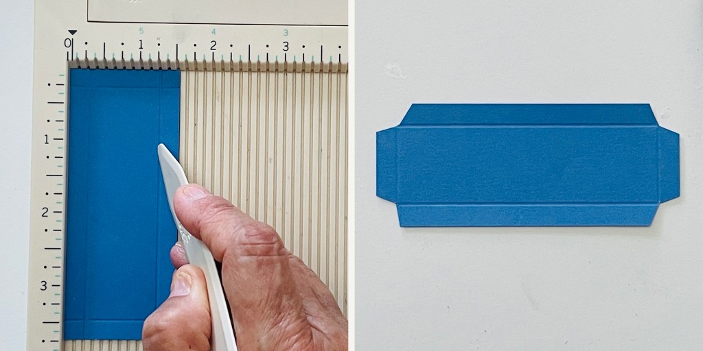 Use a scoring board to score 1/4″ on all sides of the larger blue rectangle: 3 3/4″ x 1 1/2″. Trim the corners at an angle.