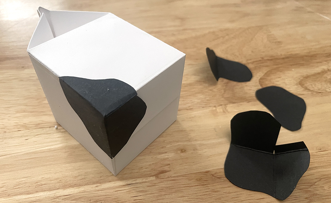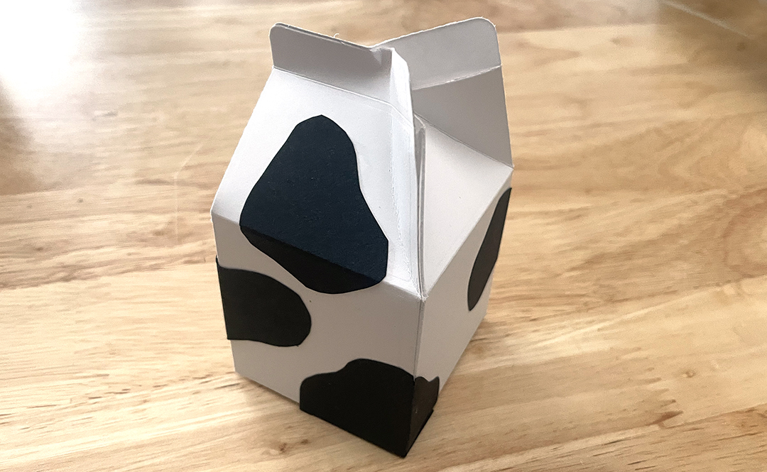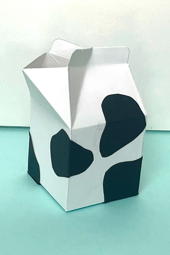 Download and print the Milk Carton Spots template above. Lay the template pieces over black cardstock and hand-cut the pieces as instructed. Set aside.