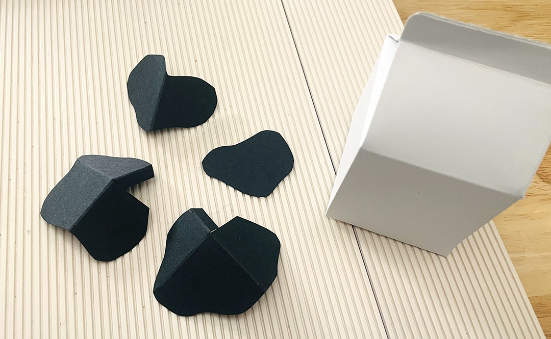 With the remaining smaller spots, fold along the random crease lines and wrap on two sides of the carton.