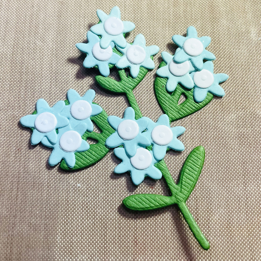 Adhere a blue flower on each of the round areas on the dark green stems. Adhere a white dot in the center of each blue flower.