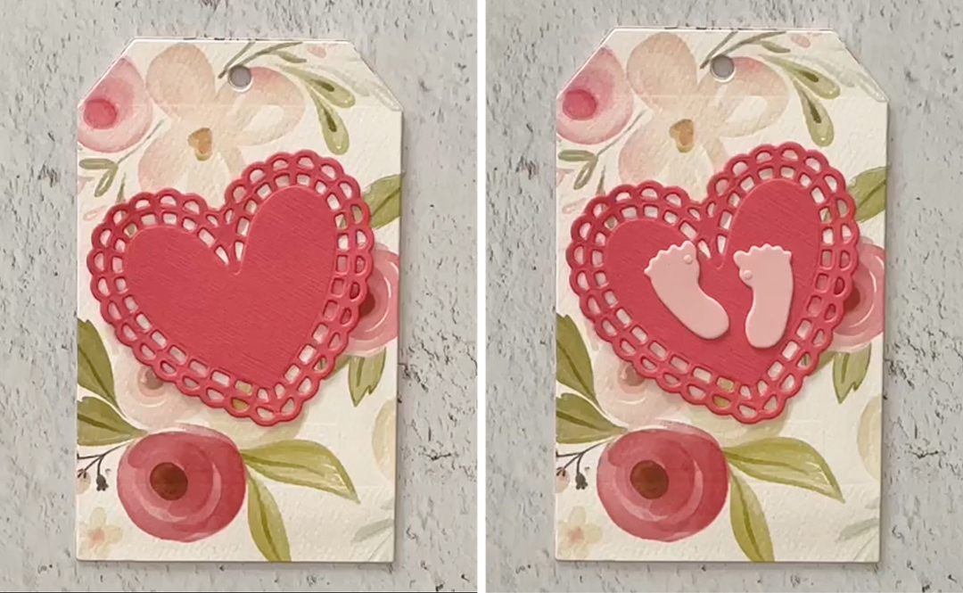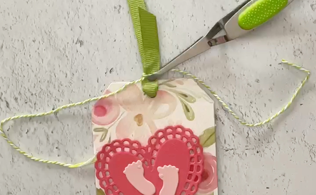 We added a lacy die cut Heart Embellishment by i-crafter and adhered two die cut baby footprints from the Ribbon Rosette Baby Add-on die set. This makes an adorable baby shower gift tag