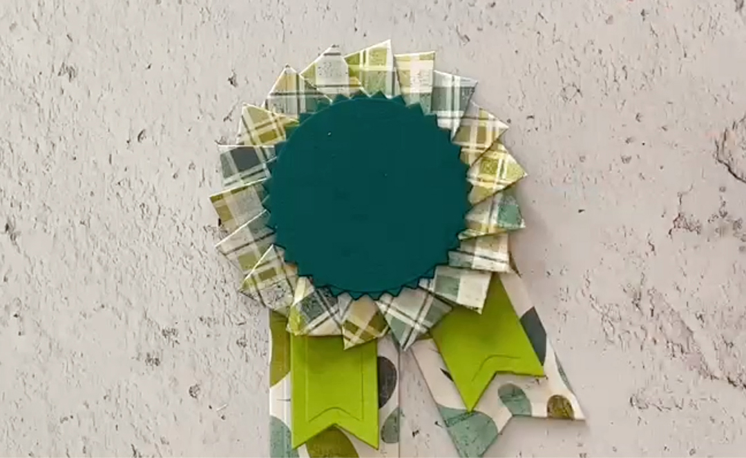 Adhere the die cut circle to secure the rosette together. Hold until the adhesive is dry