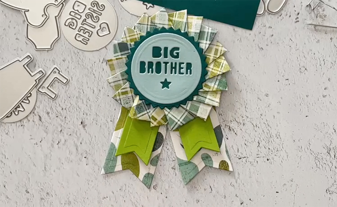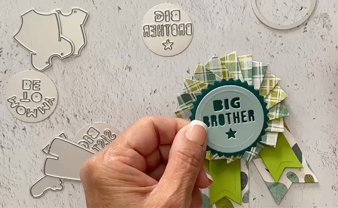 Die cut three of the large, curved pieces from the Ribbon Rosette die set, one circle for the back, one zig zag circle, two large ribbon tails, two small ribbon tails and the center circle embellishment.