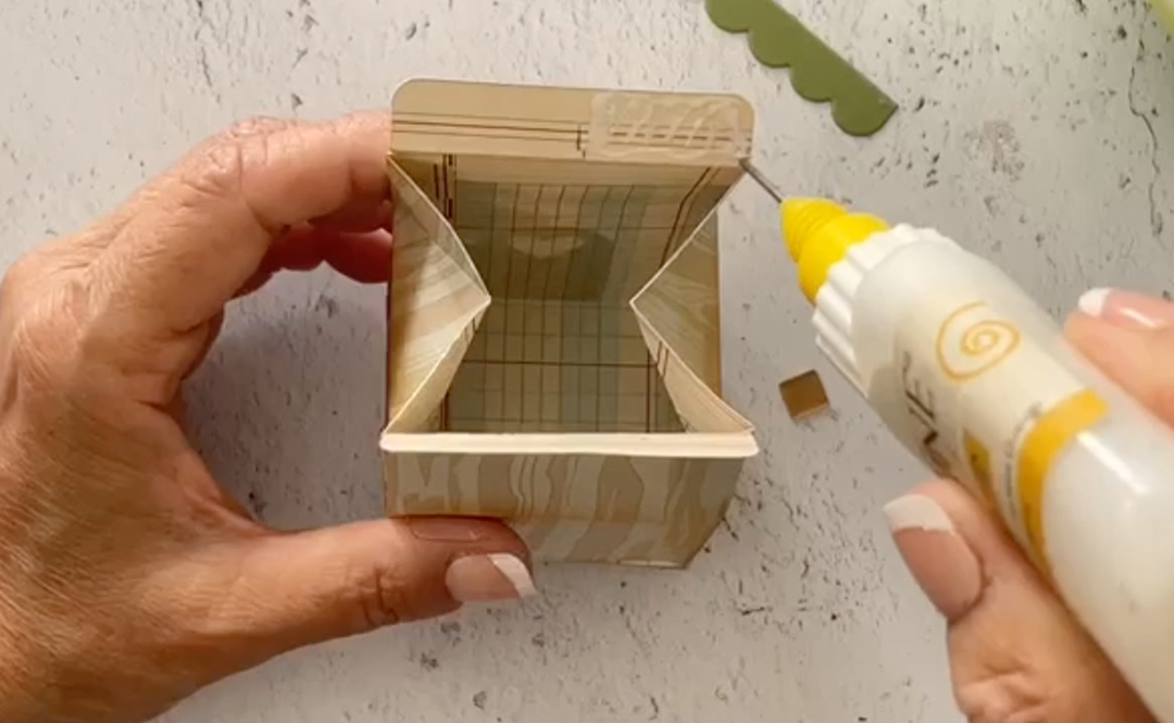 Fold the bottom flaps and adhere the flaps to create the bottom of the milk carton