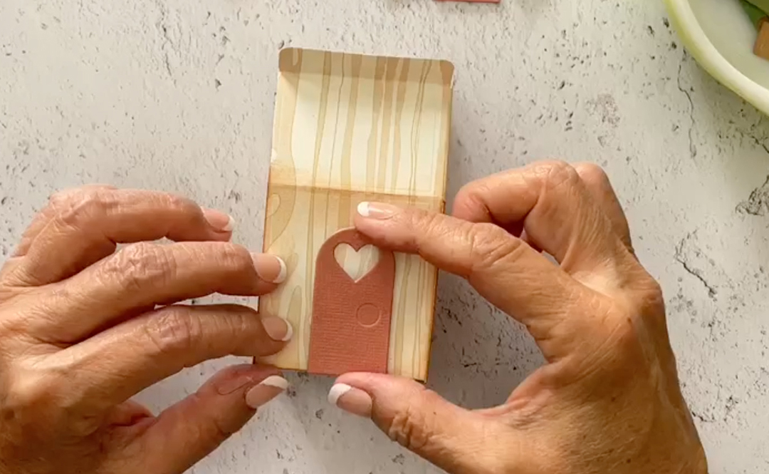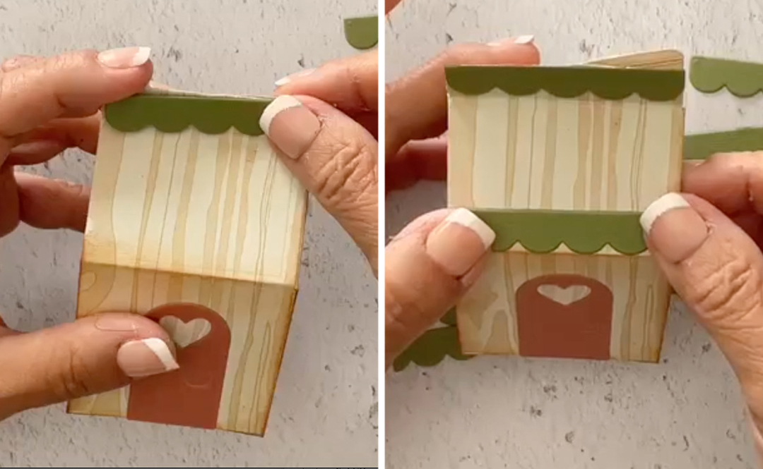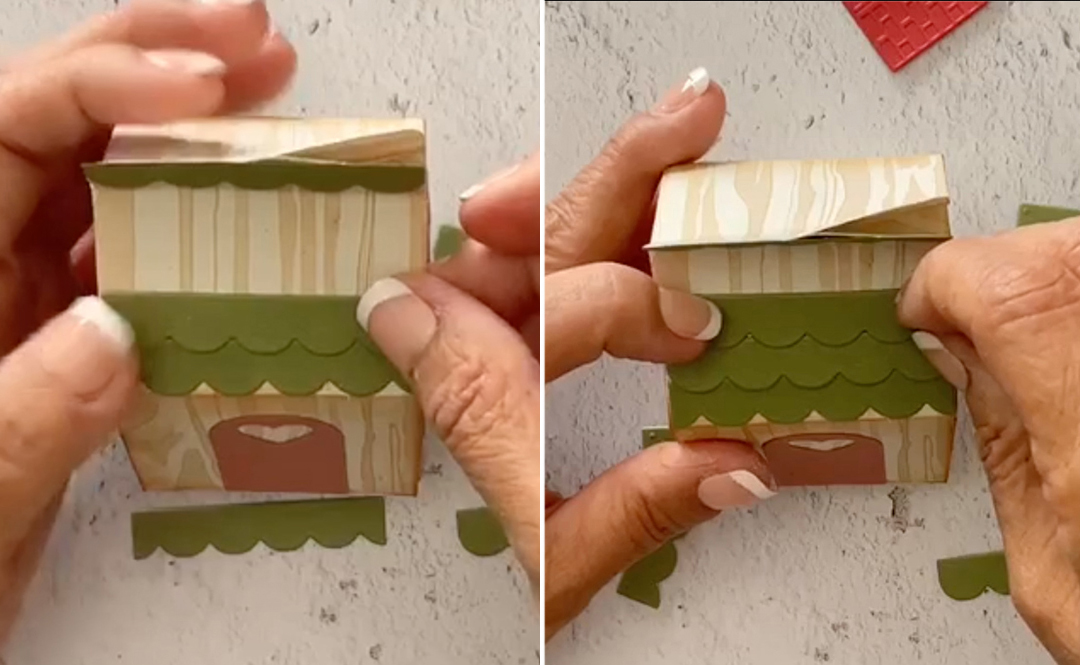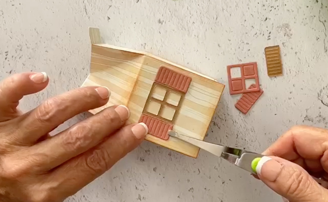 Die cut the door, windows and shutters. Adhere the door on one side with the solid roof
