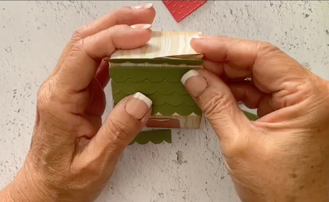 Along the bottom edge of the roof, adhere a half scallop shingle.