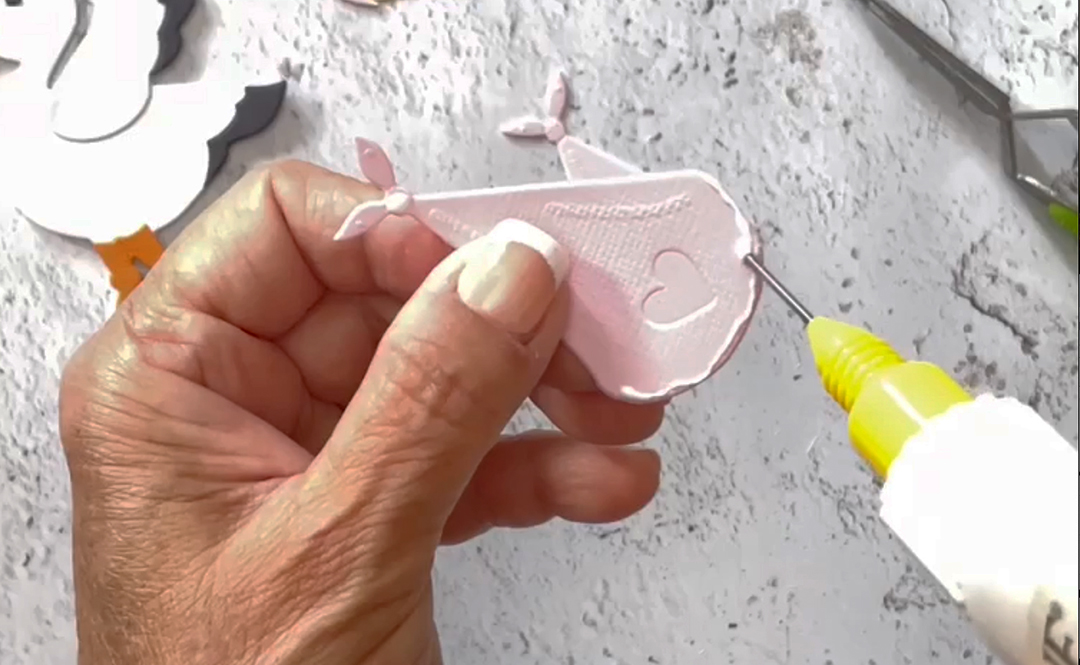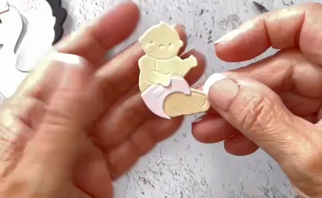 Die cut the baby shape for each stork. With a die pick, gently lift up below the baby’s hand.