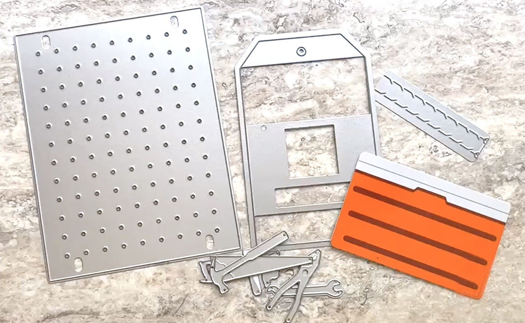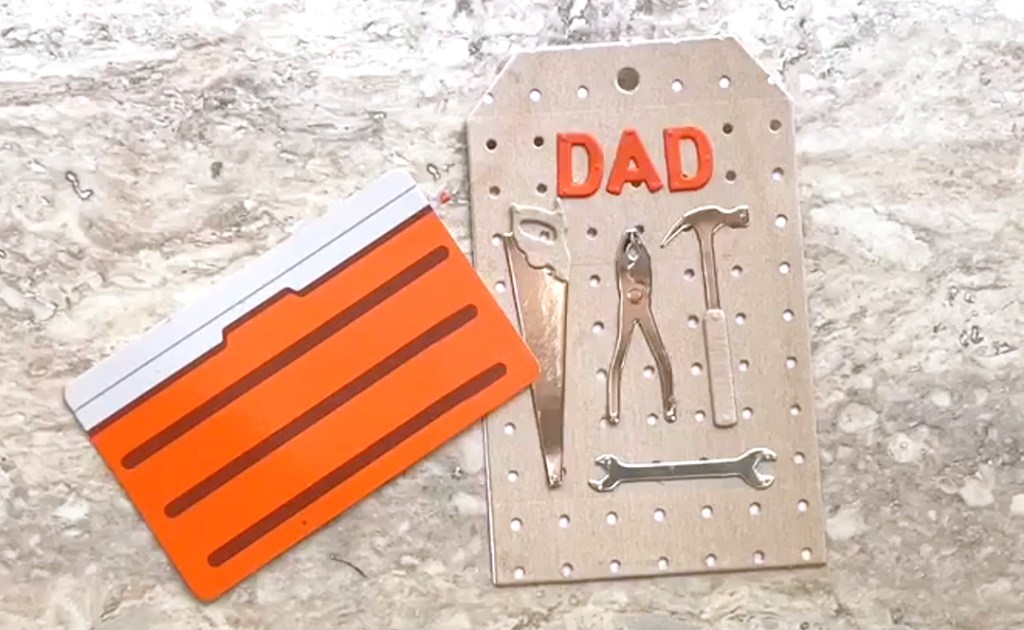 From metallic card stock, die cut the tools from the Tool Box Gift Card Holder die set. Die cut the handles for the saw and hammer from the same set and adhere to the tools.