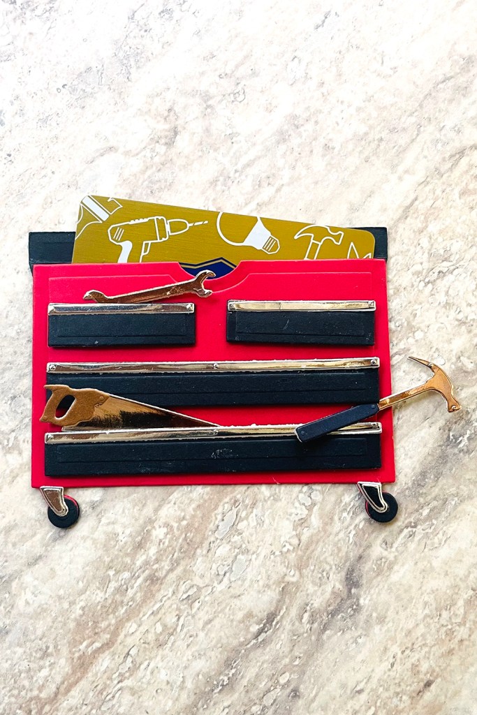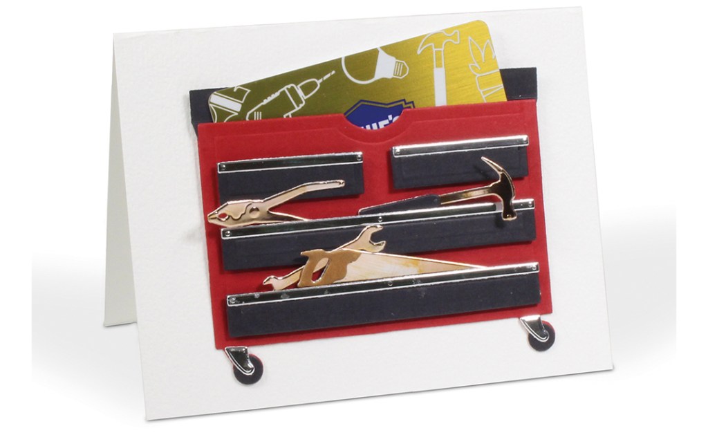 You can also adhere just the front of the tool box to the front of a card and insert the gift card or create the tool box-shaped gift card holder like we did. Either way, it will be a special gift.