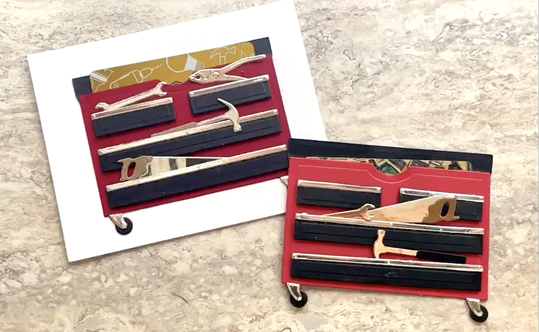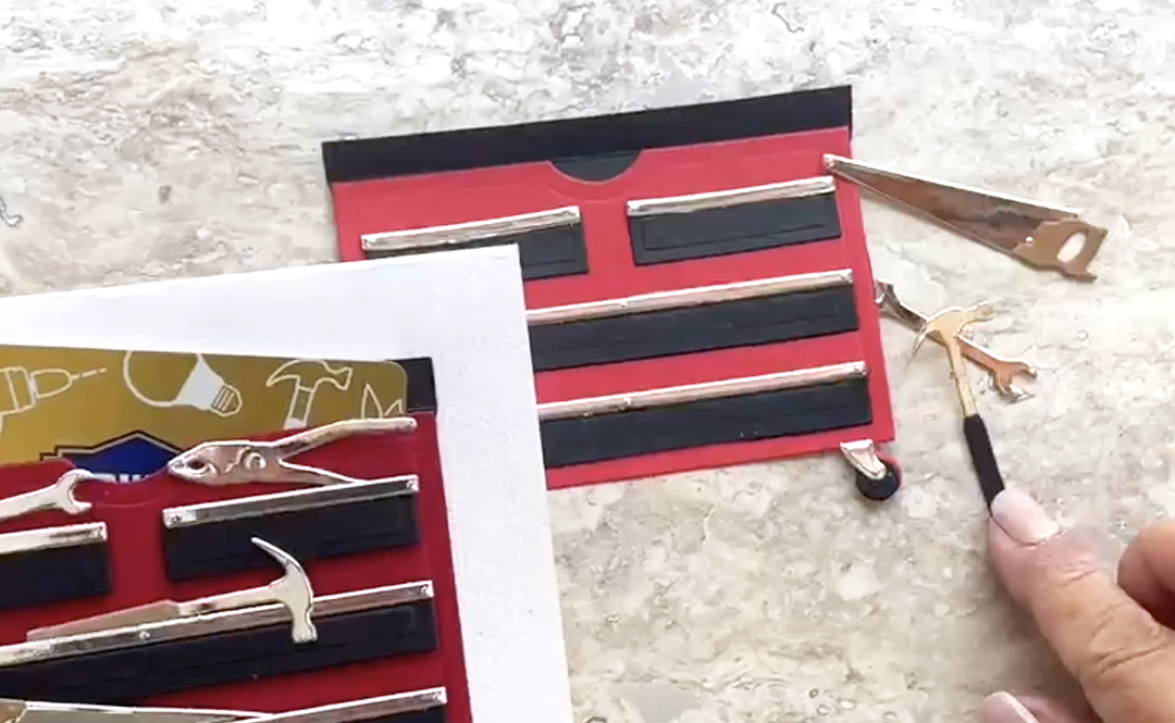 Die cut the saw, wrench, hammer and pliers out of silver card stock. Die cut the handles for the saw and the hammer from scrap card stock. Adhere these onto the drawers if desired.
