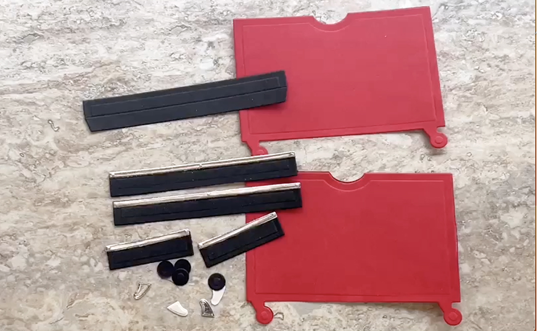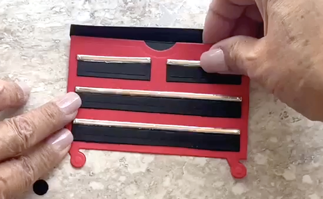 Adhere the silver strips along the top of the black drawer fronts.