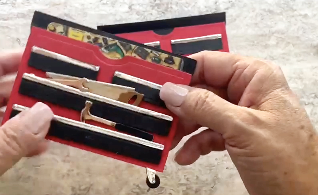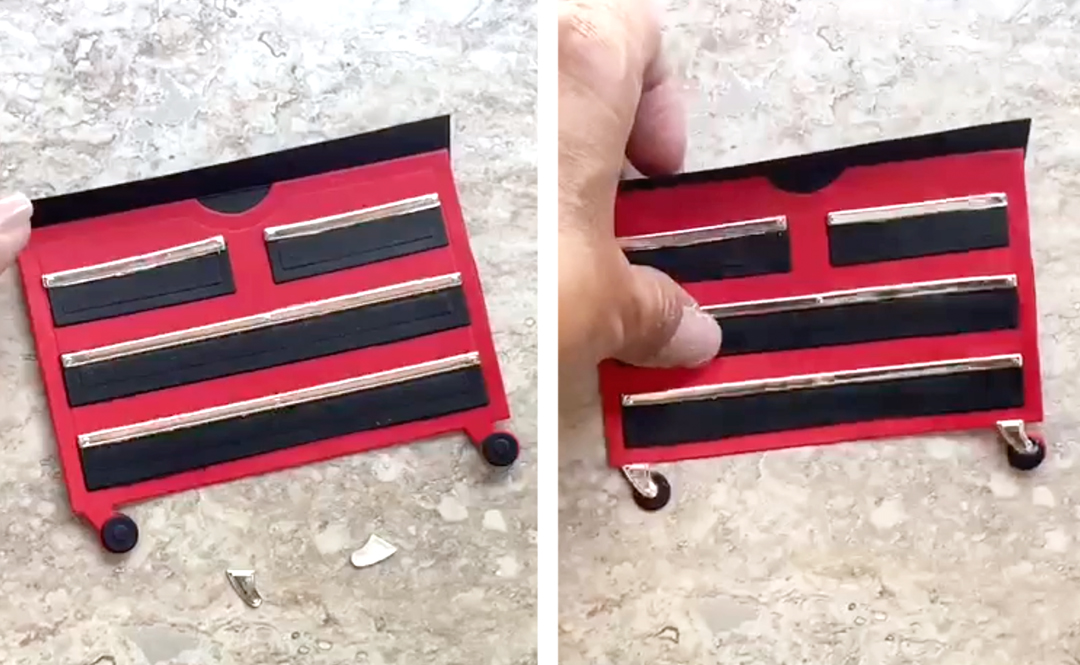 Adhere the drawers with double-sided foam tape to add depth. Tuck the tools “into” the drawers.