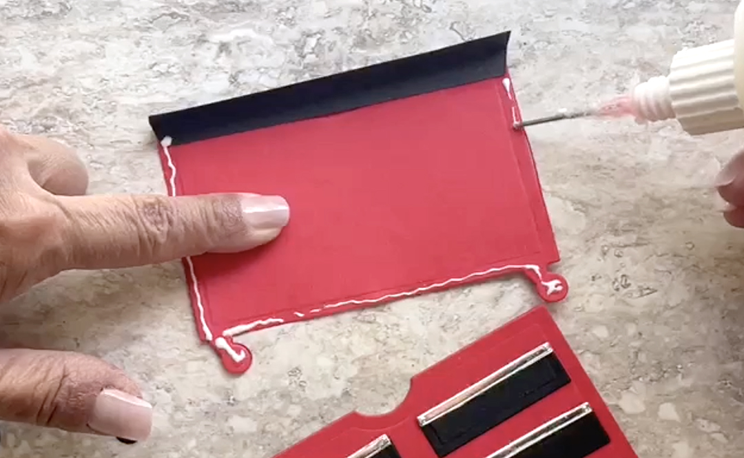 Apply a narrow line of liquid adhesive around both sides and bottom of the back tool box shape.