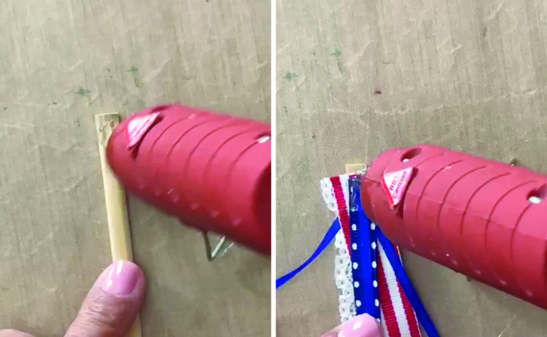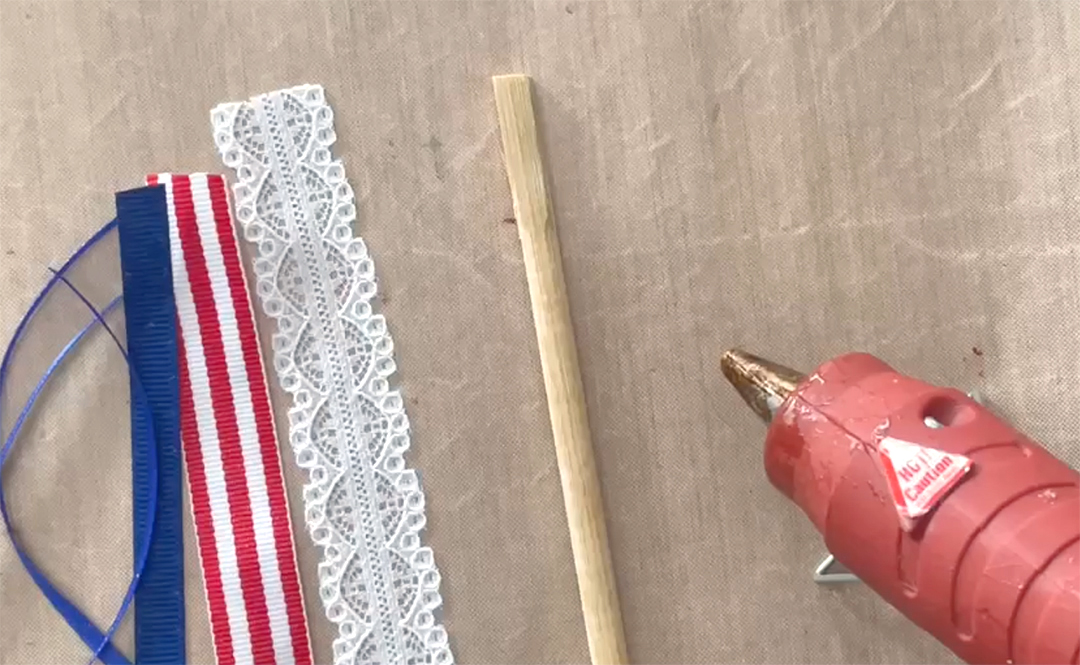 Apply hot glue on the flat end of the chopstick and begin layering the widest ribbon or lace. Continue adhering each piece of ribbon.