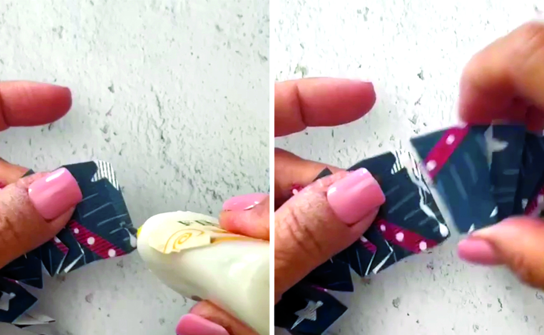 Apply adhesive to the front of the glue tab and adhere the left side of the next curved shape to the front of the glue tab.