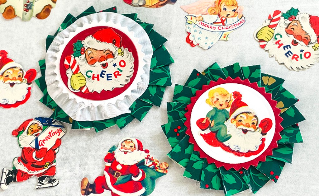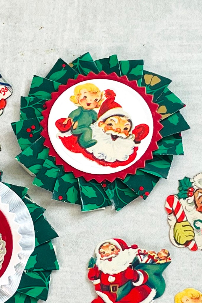 As a funny side note, the Christmas wrapping paper is from the last century (1990 to be exact). Love it and been hoarding it. The stickers were found at a garage sale so they are probably vintage from the 1960s. I included a downloadable file of the vintage stickers that you can print out and use in your own ribbon rosettes.