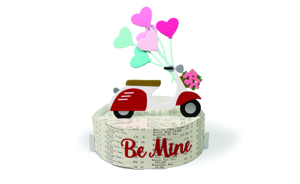 This sweet little party girl has her arms full of heart-shaped balloons. I love finding new ways to pose the Paper Cut Character dolls. I combined her with the balloons and sentiment from the Box Pops Scooter Love add-on die set from i-crafter to make this playful card. Visit i-crafter.com for their everything-must-go close out sale.